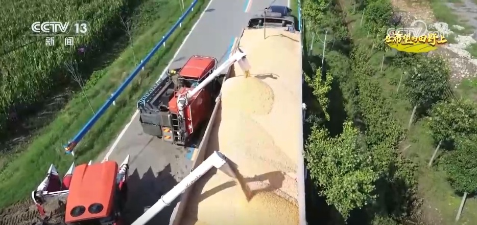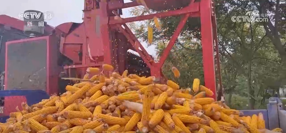 正在南阳社旗县大冯营镇张腰庄村的一处玉米地,收割机正穿越忙碌,履带碾过潮湿的田垄,玉米棒被快速收割、脱粒,顺着传送带落入车斗,空气中洋溢着清甜的玉米喷鼻。而正在大冯营镇韩营村,3台履带式收割机一字排开,丰满的玉米粒通过输送筒络绎不绝地“流”入等待的运输车内。