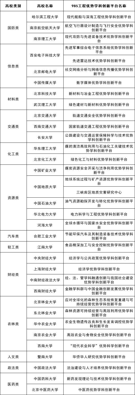 “985工程劣势学科立异平台”项目高校从地方部下“211工程”扶植的学校中择优遴选。这个平台的入选大学根基上是没有履历过归并沉组的行业特色型大学,学科精度极高,具有一至两个全国顶尖的学科,外行业范畴内承认度极高,具有深挚的行业底蕴和学科积淀。